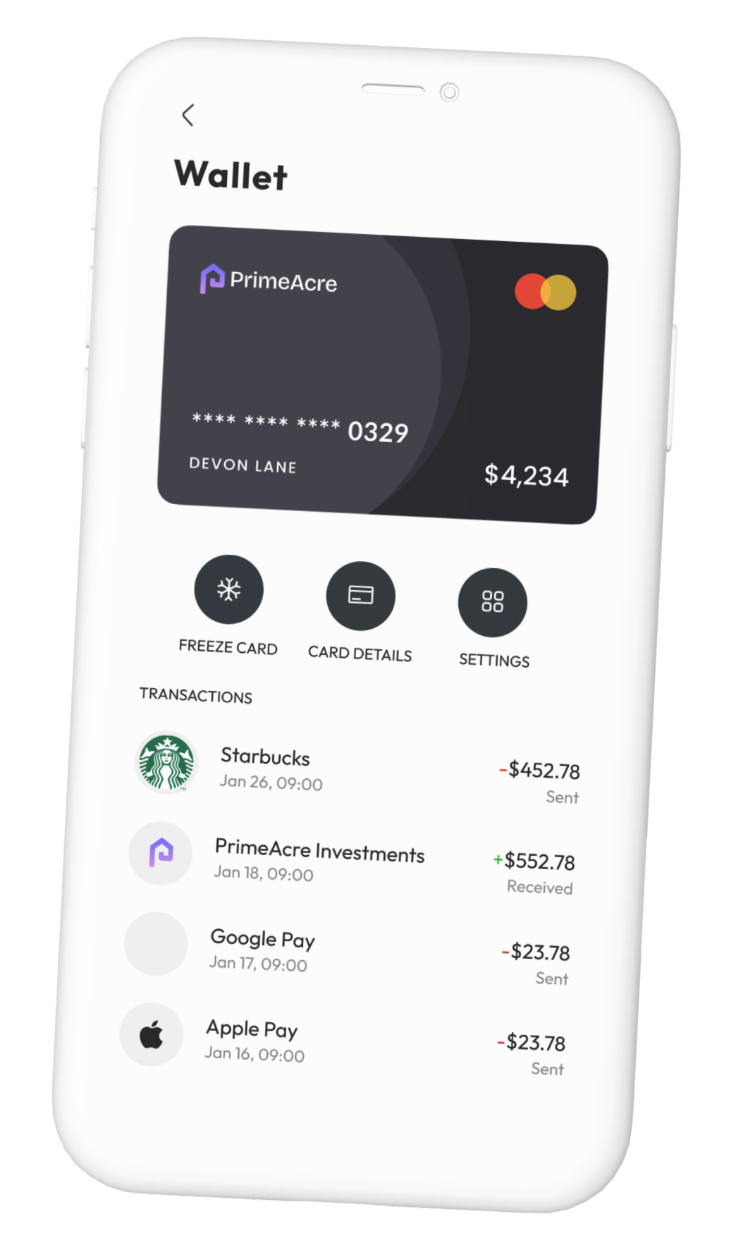 PrimeAcre introduces a unique way to manage your rental income. With our virtual and physical card system, you can receive your rental income directly into your secure digital wallet, making it easier than ever to manage your earnings.